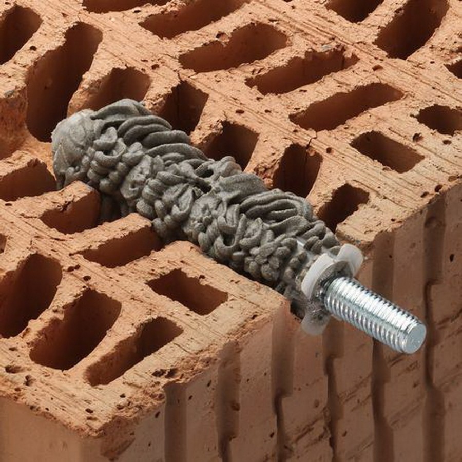 Химические фиксируются с помощью прочного клея. Он находится в капсуле в отверстии болта. При закручивании крепежа капсула раздавливается и начинается процесс полимеризации клея. Такой крепёж можно использовать для монолитных и пустотелых конструкций.