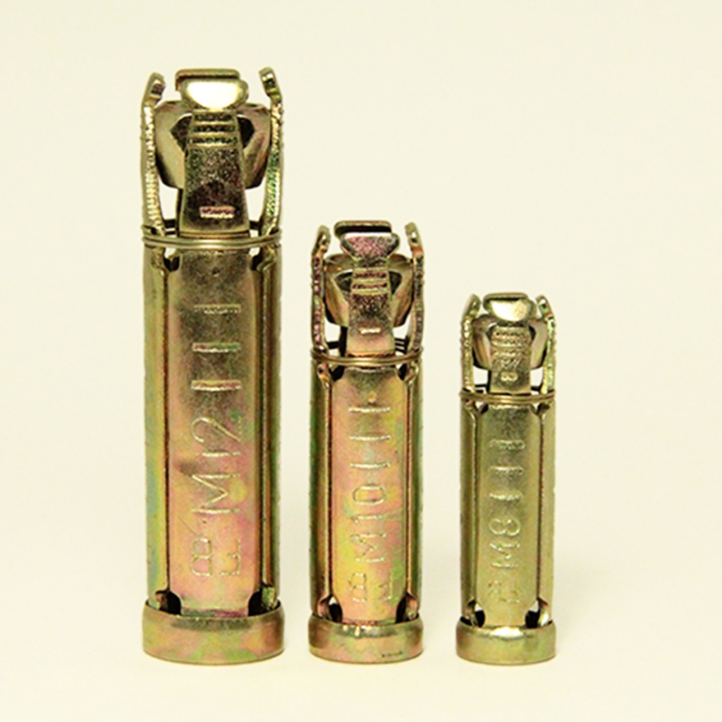 Данный анкер относятся к типу заклинивающих элементов. Он имеет металлическую гильзу, на одном конце которой располагается распорная часть из четырех сегментом, а на втором находится резьба с гайкой и шайбой.