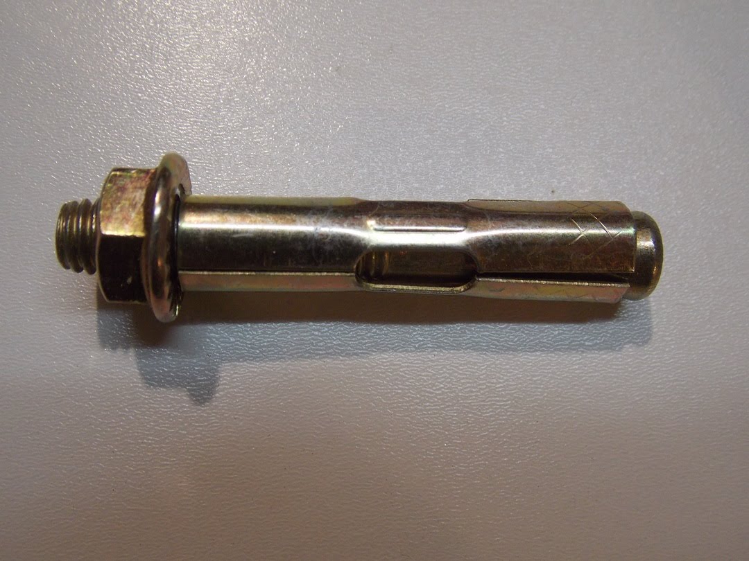 Болт анкерный с гайкой. Состоит из трёх частей. Главный элемент — шпилька, на одном конце которой нарезана метрическая резьба, а на другом находится конусное утолщение. На шпильку надета металлическая трубка с прорезями, а на резьбе находится работает по типу распора: гайка в процессе навинчивания на шпильку втягивает её конусный край внутрь трубки, разжимая её и распирая в отверстии.