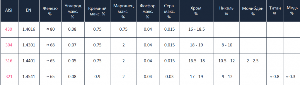 Нержавеющая сталь представляет собой сложный многокомпонентный сплав на основе железа. В его состав входят углерод и другие элементы, повышающие устойчивость к агрессивной среде. Одним из основных легирующих компонентов является хром, содержание которого в сплаве должно быть не менее 12%. Присутствие хрома обеспечивает: