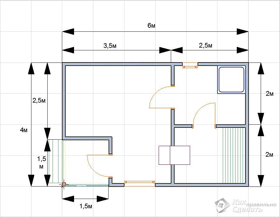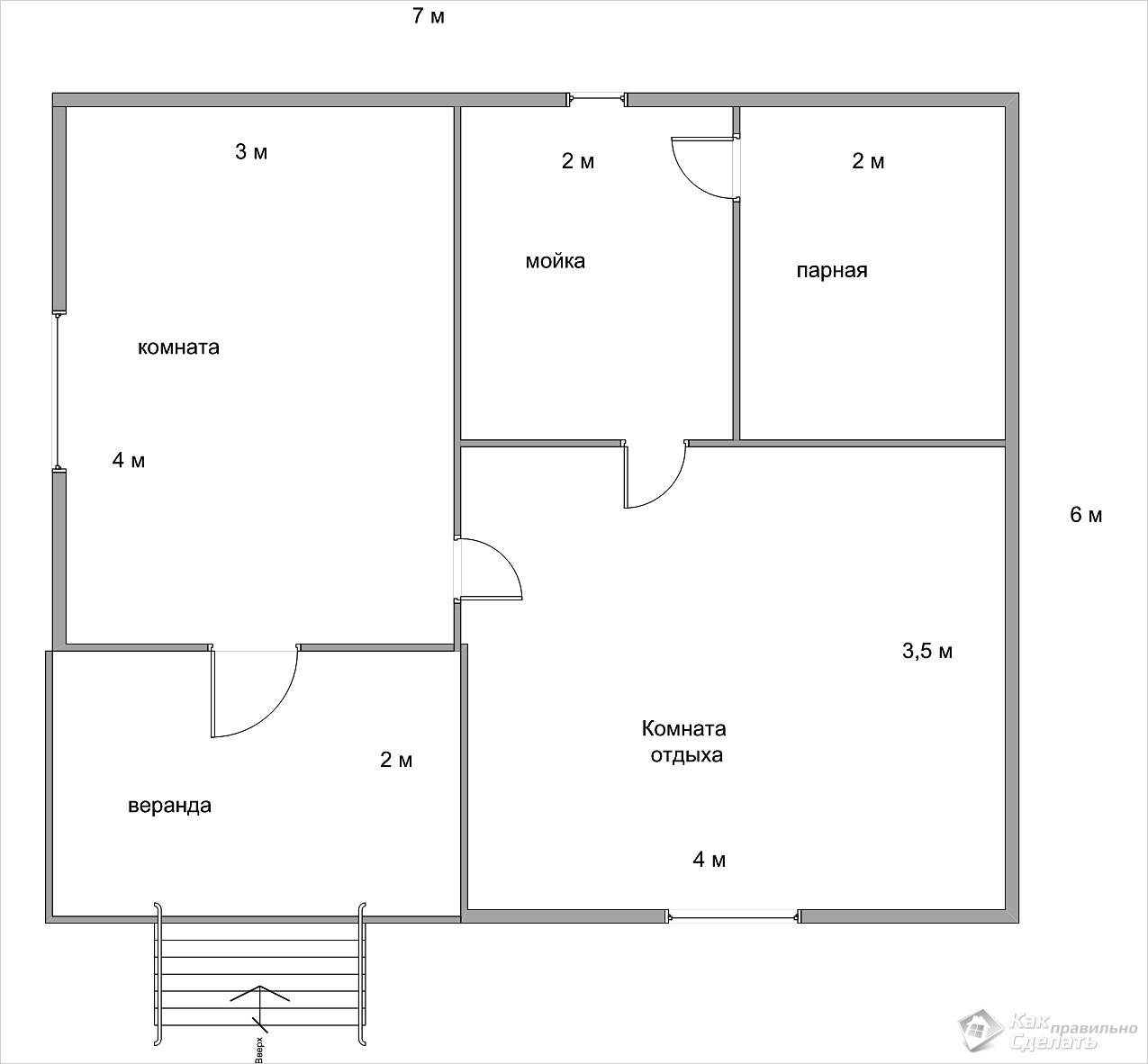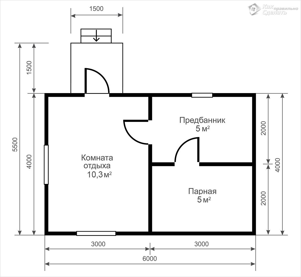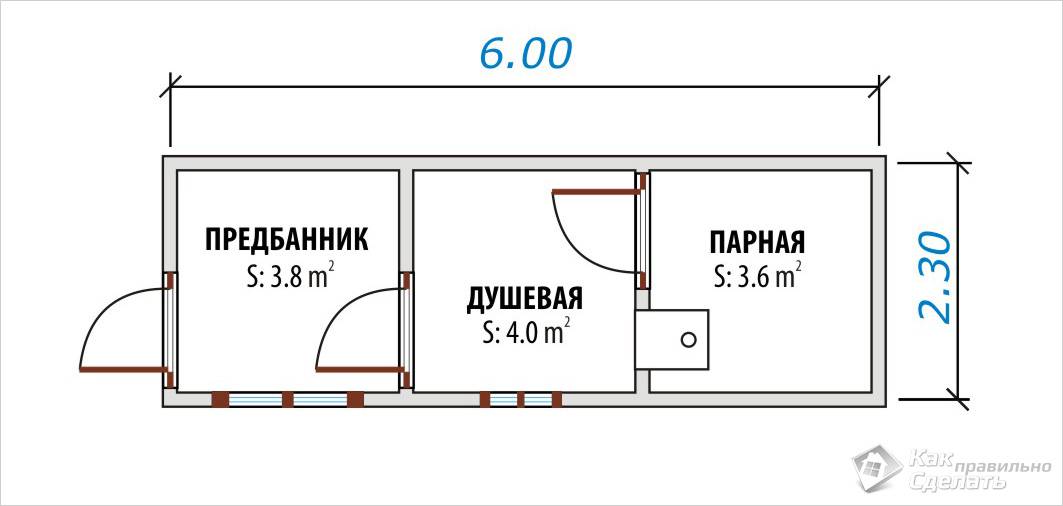 В бане 3×5 м можно расположить достаточно большой предбанник. С помощью перегородок можно обустроить несколько дополнительных комнат для одежды и дров. Парилка предполагает наличие только одной двери, ведущей в предбанник. Последний же может иметь выходы в другие комнаты.