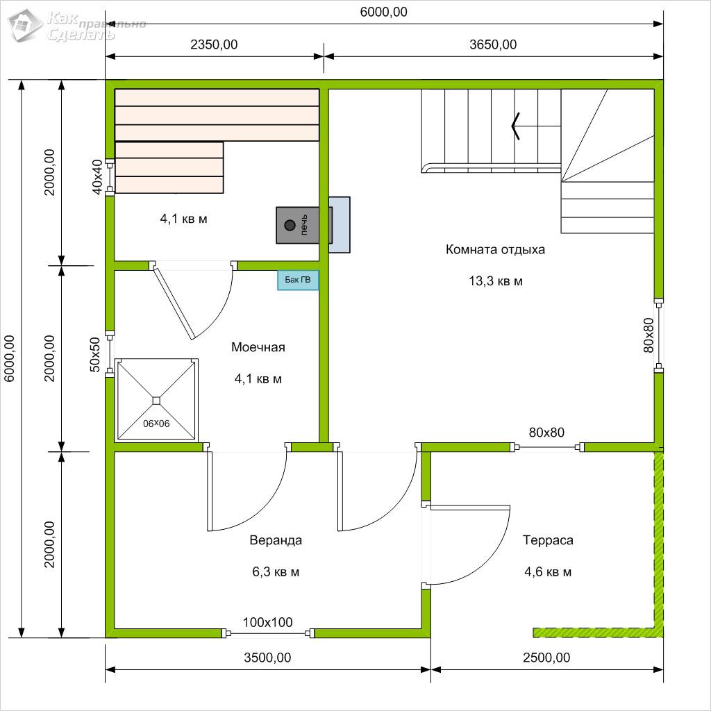 Такой вариант бани похож на 4×4, но может также иметь дополнительно небольшую террасу. Она удобна тем, что в теплое время года на ней можно отдохнуть, наслаждаясь чистым воздухом и яркими пейзажами.