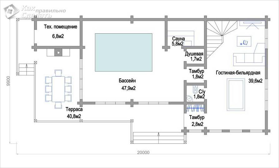 Представляет собой три помещения, которые примерно одинаковы по размеру и идут друг за другом: комната отдыха, мойка, парная. Она также удобна и имеет достаточную вместимость. Строительство бани занимает в среднем около 10 дней.