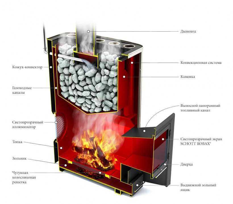 - Камера сгорания. Здесь идет процесс горения дров. Для управления им используются дверцы топливника и поддувала. Последнее служит для подачи воздуха в топку. Удаление из печи продуктов горения выполняется через зольник — металлическую решетку. Из топки жар от горящих дров поднимается к бункеру с камнями.