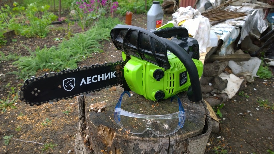 Компания Лесник оснащает свои бензопилы стандартным набором необходимым для начала работы, поэтому покупая инструмент вы не найдете в коробке с ней дополнительной цепи или шины.