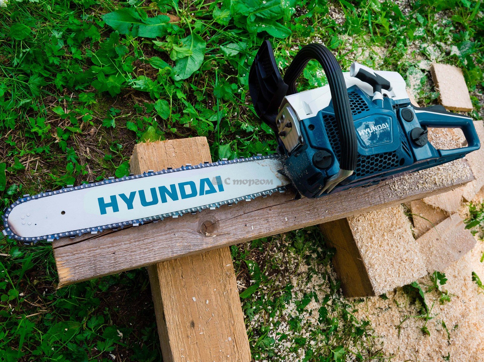 Hyundai XE 2400. Эта универсальная электропила характеризуется поперечным размещением двигателя, мощностью 2 400 ватт. Инструмент комплектуется 450 миллиметровой направляющей шиной и пильной цепью, с шагом 3/8 дюйма. Такая конфигурация позволяет использовать электропилу при выполнении самых разнообразных задач, в том числе для распиловки дров, строительных и ремонтных работ. Пила оснащена функцией «Плавный пуск», имеет антивибрационную систему и инерционный тормоз. К недостаткам этой электропилы можно отнести относительно большой вес – 6 килограмм.