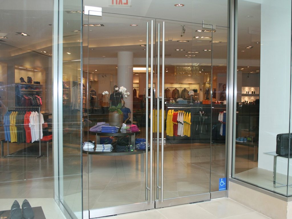 Стеклянные торговые двери могут иметь различную конструкцию. Они состоят из одной или двух створок. Размер, тип, особенности крепления (к потолку или полу, в проеме) зависят от размера помещения, его проходимости.