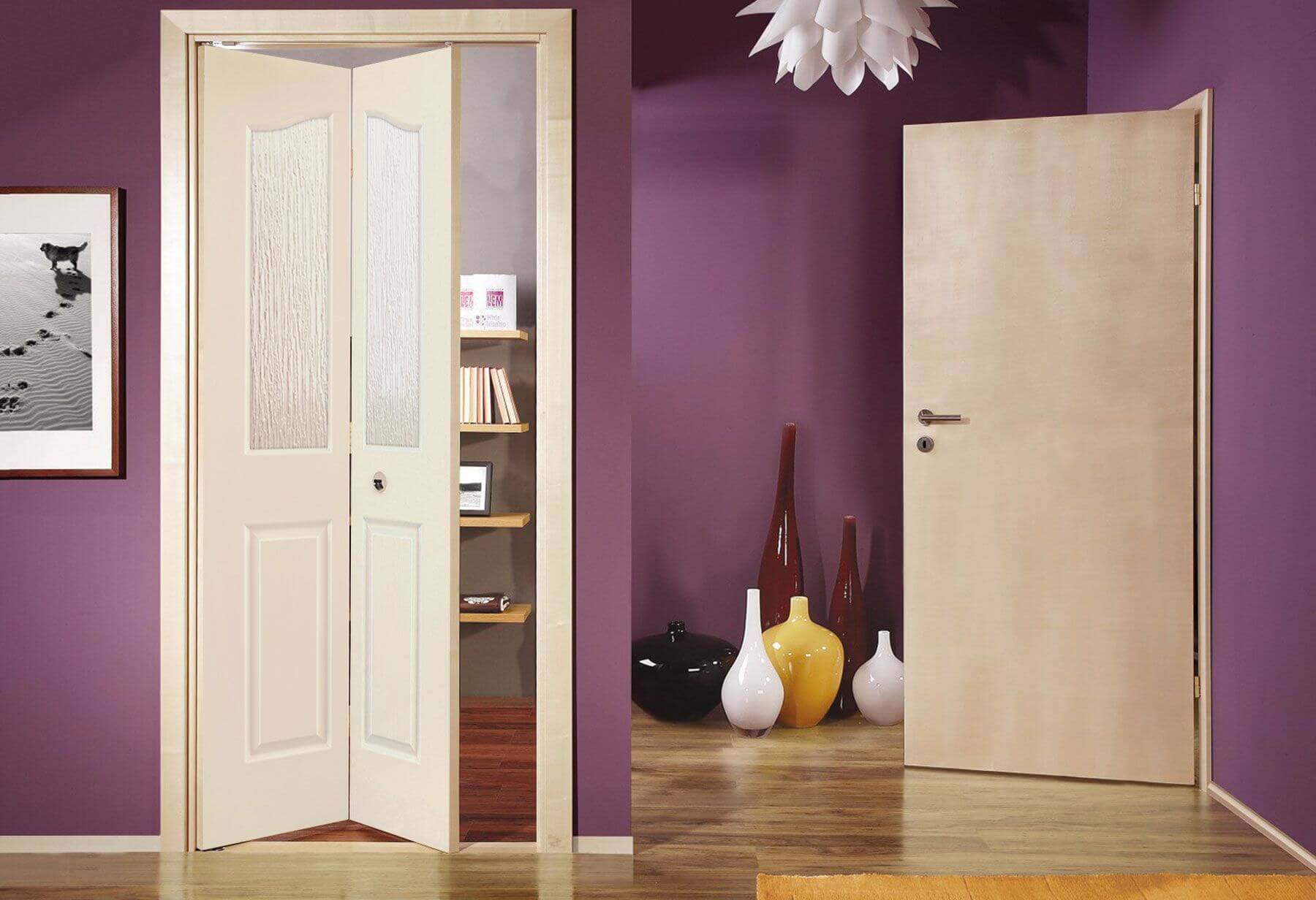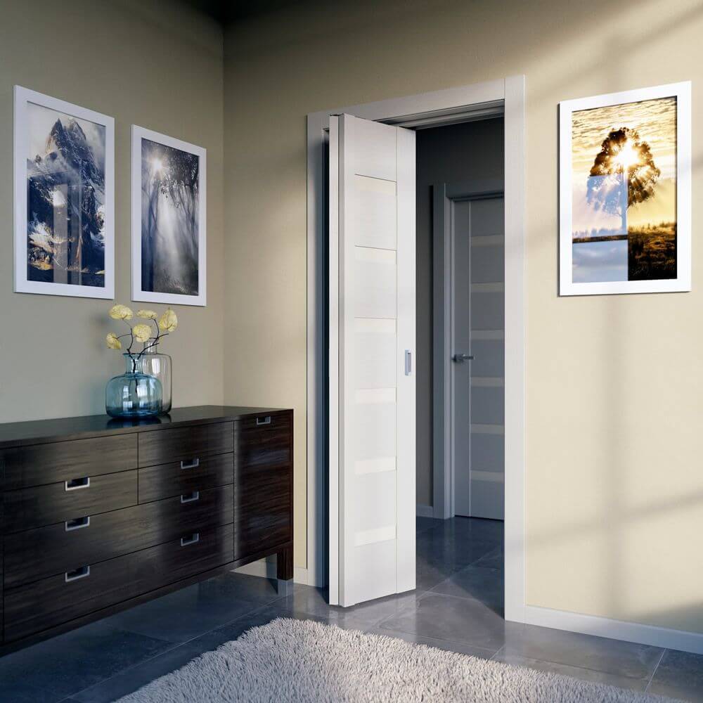 При открывании конструкция скользит по направляющим на ролике и складывается, а при закрывании — раскладывается. Этот тип хорошо подходит для узких дверных проемов. Складные двери не обеспечивают идеальной защиты от шума и холода, а также требуют частого ремонта механизма открывания. Но это преимущество для интересного дизайна интерьера и разделения помещений на зоны;