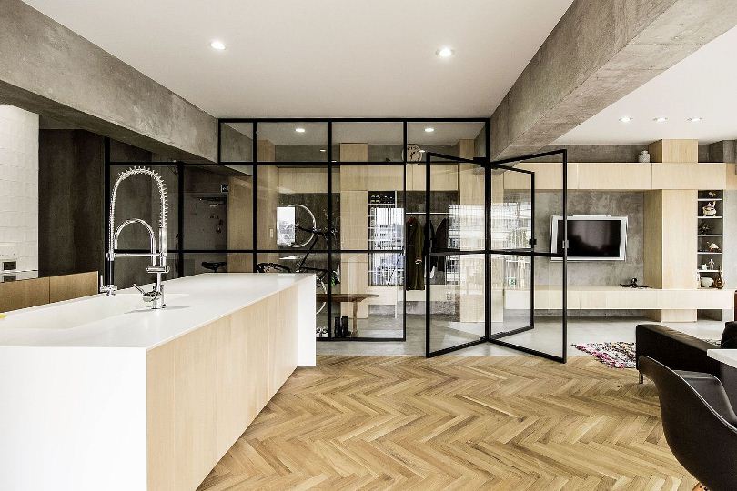 Раздвижные темные деревянные изделия со стеклянными горизонтальными полосками превосходно подчеркнут индустриальный характер интерьера лофт.