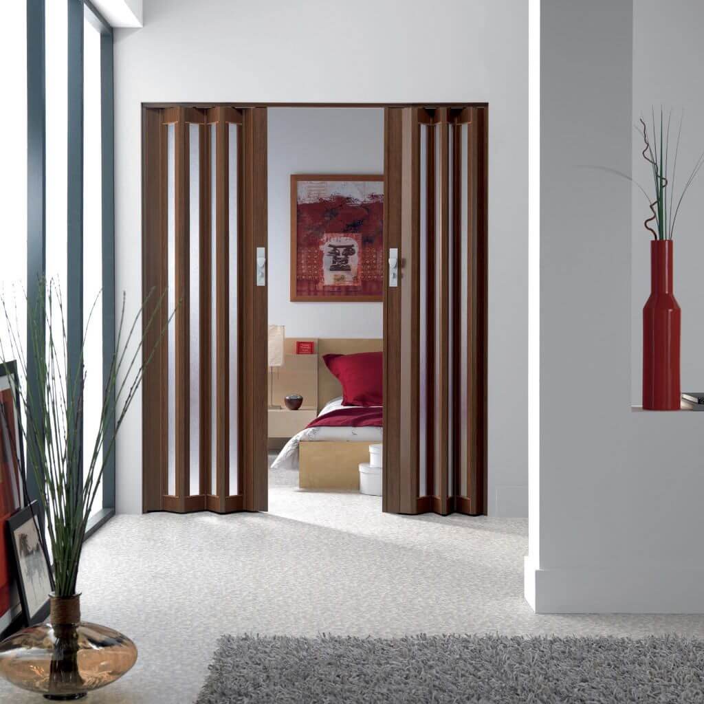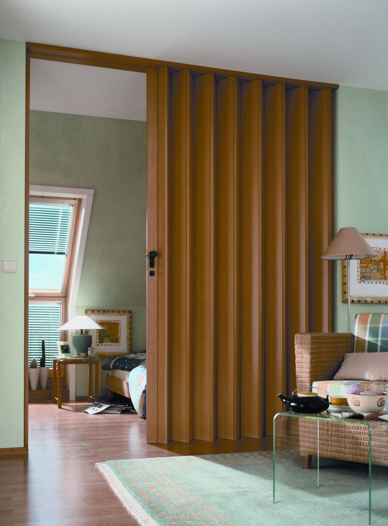 Этот тип дверей имеет немного больше планок, что при раздвижении делает их похожими на гармошку. Двери изготавливаются из различных материалов, от дерева до металла. Они очень функциональны и полезны, так как позволяют разделить комнату на две зоны. Так вы можете отделить комнату от столовой или объединить кабинет с гостиной или спальней, ведь такое разделение будет выглядеть как простая перегородка или ширма и поможет вам играть с пространством.