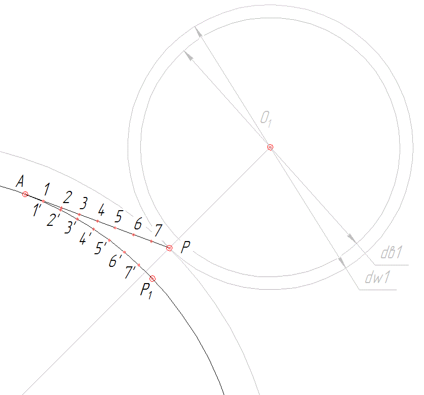 4.4. Через точки 1′; 2′; 3’… проводим перпендикуляры к соответствующим радиусам О21′; О22′; О23’…. На перпендикулярах (они касаются основной окружности) откладываем отрезки 1’1»; 2’2»; 3’3»…, соответственно равные отрезкам Р1; Р2; Р3….