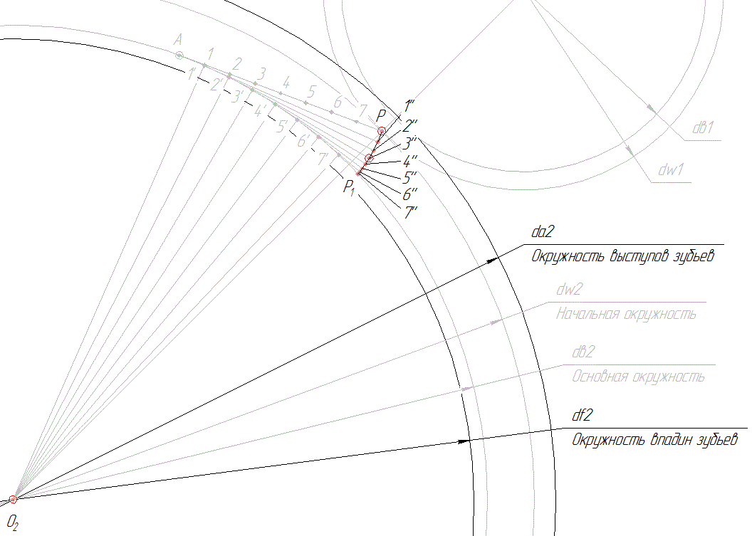4.5. Соединяя точки Р1; 1»; 2»; 3»… плавной кривой, получаем часть эвольвенты второго колеса.