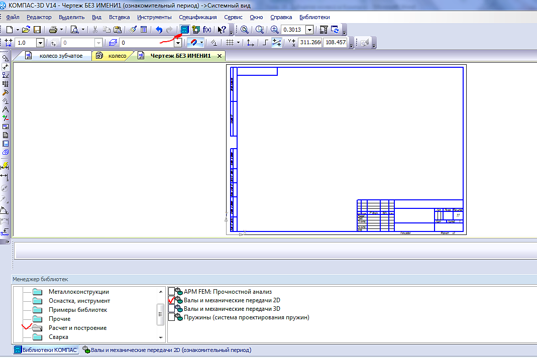 2 Вызываем библиотеку Валы и механические передачи 2d, нажав на кнопку Менеджер библиотек на стандартной панели. Выбираем вкладку Расчет и построение. Дважды щелкаем по нужной библиотеке.