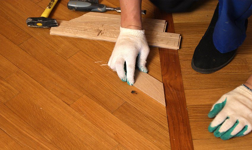 Сначала стамеской и молотком аккуратно подбиваете отовравшиеся паркетины с поверхности пола так, чтобы не повредить боковые замки паркета. Если паркетных планок много, то имеет смысл нанести на них цифрами очередность их снятия — это позволит вам затем не ошибиться при их укладке обратно. Лучше не заниматься реконструкцией уже устоявшегося паркетного рисунка.