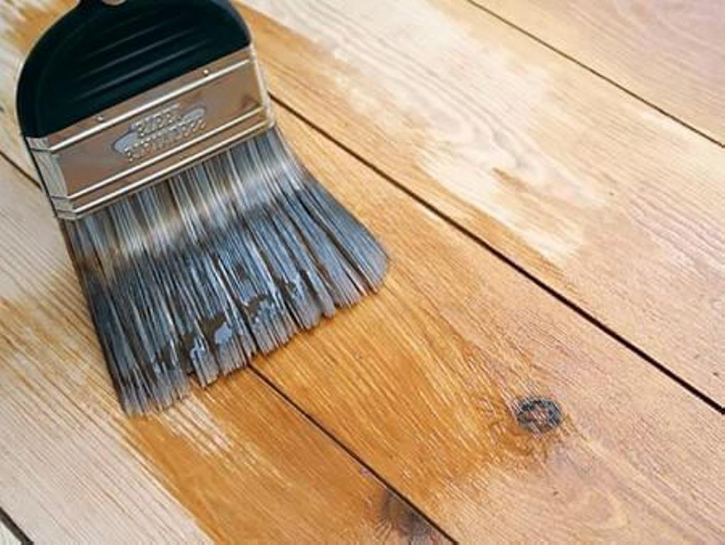 Следующий этап – первичная лакировка, лак наносится широкой кистью или валиком. Он быстро впитывается в древесину, заставляя ее волокна подниматься. Поэтому после высыхания лакового слоя отшлифуйте пол наждачной шкуркой Р100 – 120. Затем снова тщательно обработайте помещение промышленным пылесосом.