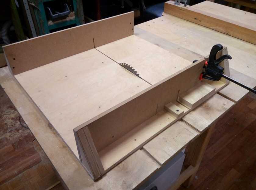 В столешнице электролобзиком перпендикулярно вырезу под диск делают два параллельных пропила. По ним будет скользить подвижный угольник, играющий роль бокового упора. Он поможет делать ровный распил, при необходимости, под заданным углом.