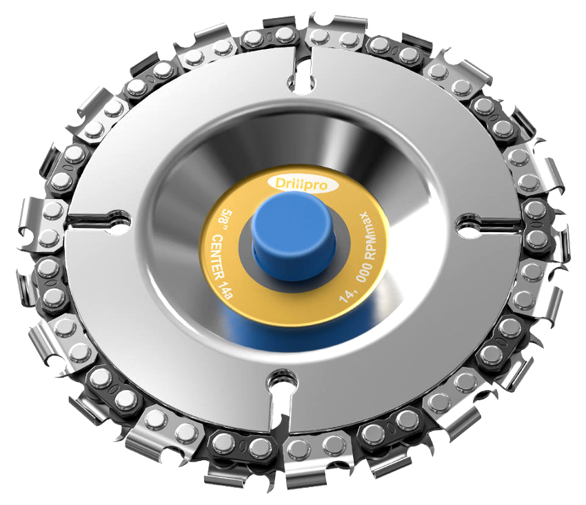 На первый взгляд, может показаться что это приспособление для фильма ужасов, но судя по отзывам обладателей, этот диск более безопасен, чем выше представленные аналоги. Представляет он собой сплошной круг, по краям которого находится цепь от бензопилы, сделано всё из высококачественной инструментальной стали. Основное предназначение такого диска: фрезерование, моделирование, зачистка дерева от коры и вырубание чашек в бревне для срубов. Резать таким диском также можно, учитывая что ширина пропила будет составлять около восьми миллиметров, т. к. толщина цепного диска составляет шесть миллиметров. Говоря о диаметрах, то в продажи есть 125 и 230 диски. Эксплуатационный срок такого диска будет в разы больше чем у других, т. к. его всегда можно подточить напильником. Цена на них колеблется в диапазоне от двух до трёх тысяч рублей, а с доставкой из другого региона выйдет и того больше.
