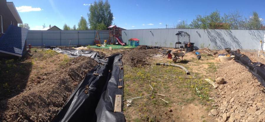 Вот и все манипуляции. Дренажная система готова! Скажите, разве это очень сложная работа? Конечно, нет, но признаюсь честно — весьма трудоёмкая. Зато она имеет колоссальное значение!