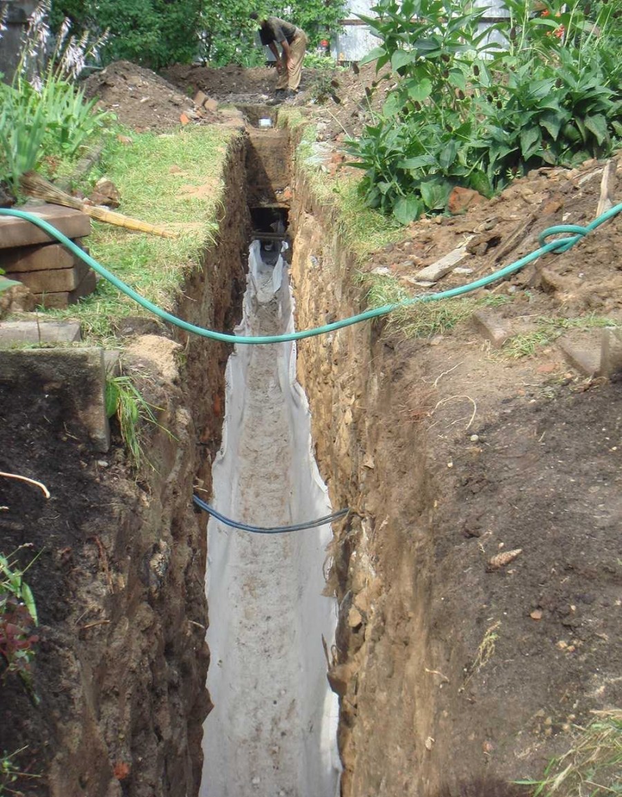 Дно траншей укрывается мелким гравием, а сверху него укладывается геоткань