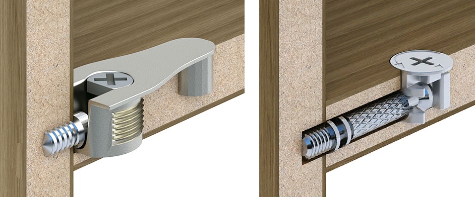 Самым популярным крепежом на сегодняшний день является специальный эксцентриковый зажим, на штоке которого сделана резьба под ДСП.