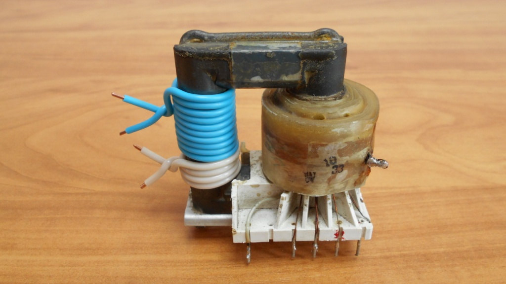 На магнитопроводе трансформатора надо намотать пару дополнительных обмоток. Катушка L1 содержит 10 витков, намотанных проводом диаметром 1 миллиметр. Катушку L2 мотаем проводом 1,5 миллиметра, всего 4 витка. Обе катушки должны быть намотаны в одну сторону. Вторичная высоковольтная обмотка остается без изменения.