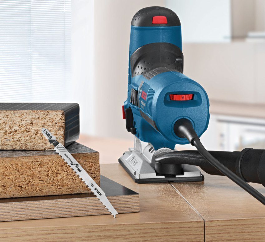 Возглавляет список электролобзик Bosch. Его основные достоинства – это небольшая степень вибрации, надежное крепление подошвы, небольшой вес и габариты. Все это делает его очень удобным для домашних работ. Рука при работе устает минимально, благодаря конструкции корпуса и креплению подошвы, а функция обдува позволяет следить за линией распила. Модель хорошо проявляет себя при работе с деревом, фанерой и металлом, так что ее можно считать универсальной.