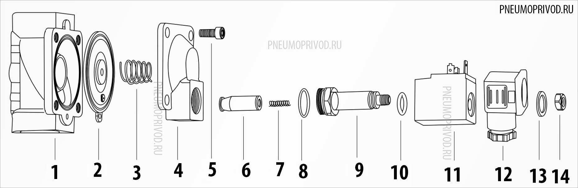 | 8. | Уплотнение | 9. | Плунжер | 10. | Уплотнение | 11. | Катушка | 12. | Коннектор | 13. | Уплотнение | 14. | Гайка |