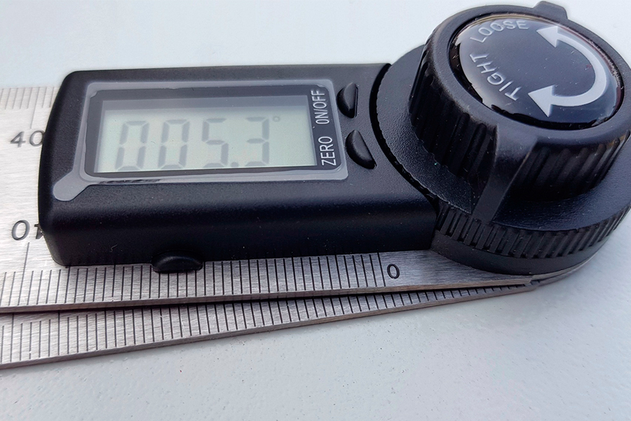 Это прибор, обладающий цифровой индикацией, необходимой в измерении углов. Для удобства каждое плечо приспособления снабдили разметкой, позволяющей устанавливать точное значение для отметок на контактных плоскостях. Электронное устройство угломера имеет специальные функции, позволяющие осуществлять как сброс, так и заморозку полученных результатов, что добавляет удобства в работе. При этом точность прибора находится на достаточно высокой отметке, погрешность составляет всего 0.3о (градуса).