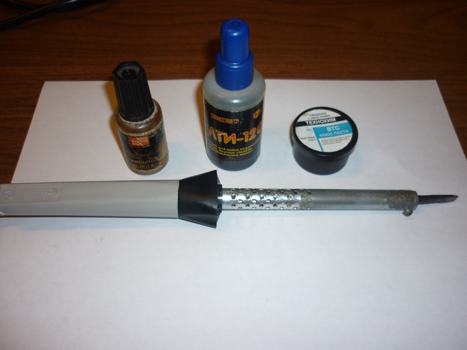 - Паяльная кислота. Состав данного флюса включает в себя сильные кислоты — ортофосфорную или соляную и хлористого цинка, который может достигать 50% в растворе. Доступный и дешевый материал, разъедающий все жировые пленки и позволяющий спаивать почти любые виды металлов. Но кислота очень токсична, поэтому работы следует проводить вне жилых помещений с применением индивидуальных средств защиты. Помимо этого, является неплохим проводником электричества, даже малейший остаток на соединении разъест дорожки платы, поэтому ее лучше не использовать совсем.