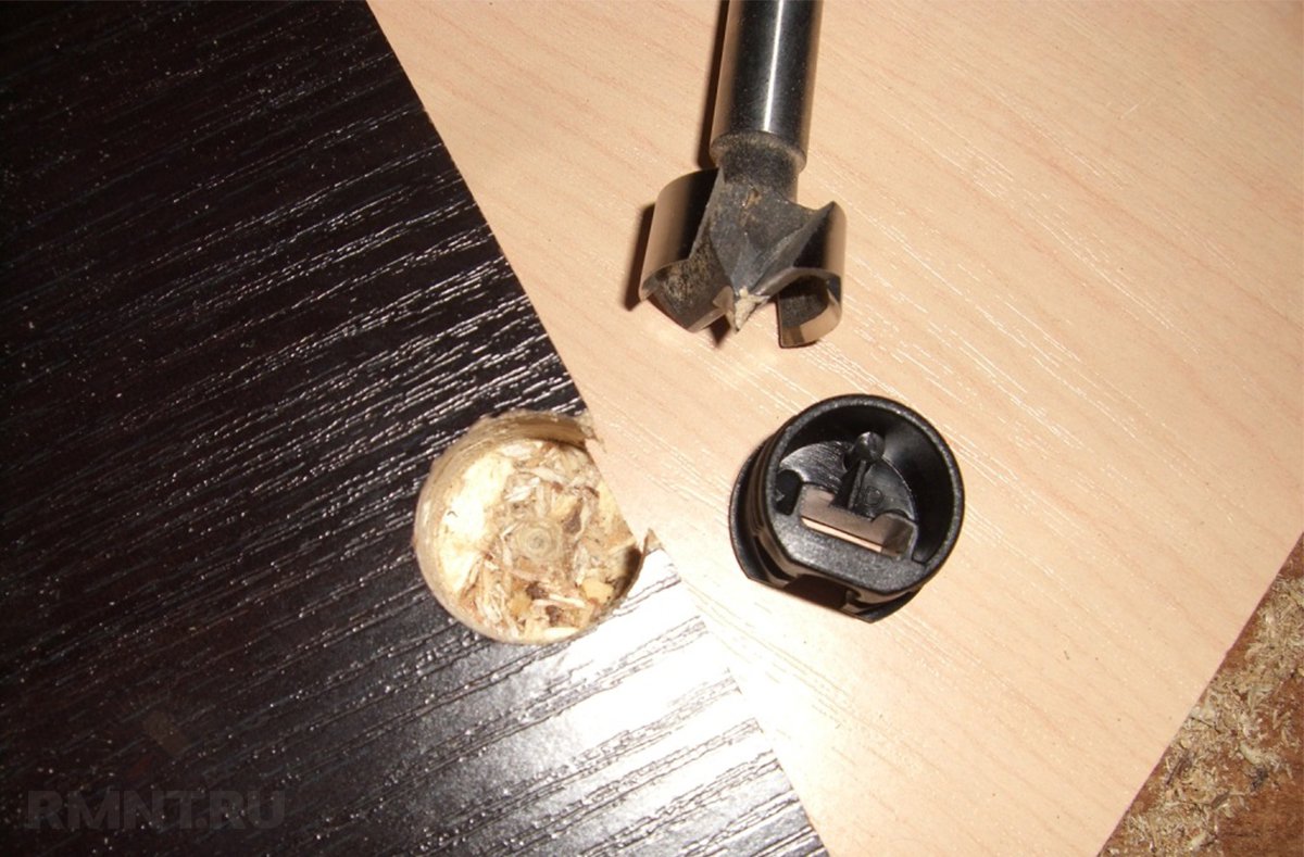Используемый инструмент, предназначенный для обработки принято считать ручной фрезер. Существуют средства исполнения корончатого типа, они позволяют выполнять работы обыкновенной дрелью. В таком случае, фрезерная головка, применяемая по дереву, выполняет роль обработки кромок, изготовления простых отверстий.