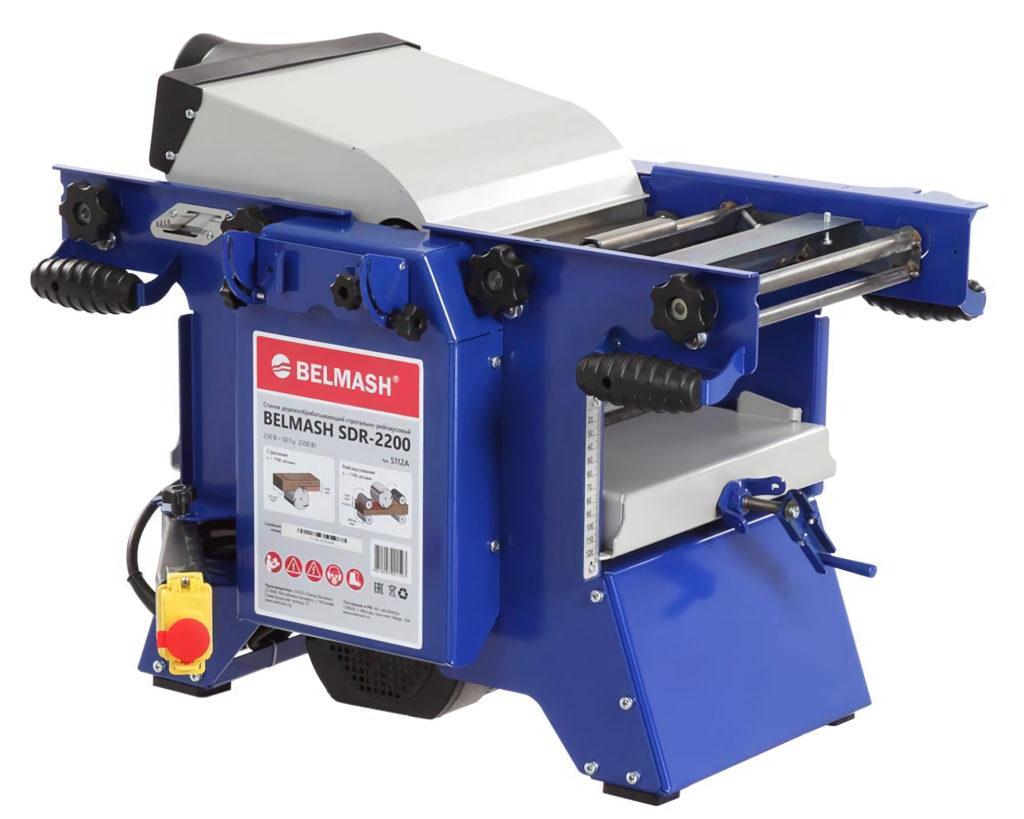Конструктивной особенностью модели является широкая станина, которая улучшает устойчивость, равномерно распределяет нагрузку, снижает уровень вибрации. Резиновые ножки с креплениями не позволяют рейсмусу скользить по основанию во время работы.