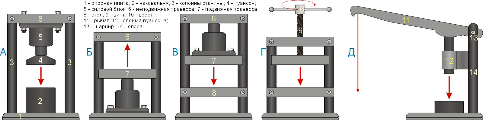 Винтовой пресс с ручным приводом (поз. Г) позволяет создавать усилие максимум до 1,5-2,5 тс. В работе с металлом применяется, когда такого достаточно, в след. случаях (см. также видео):