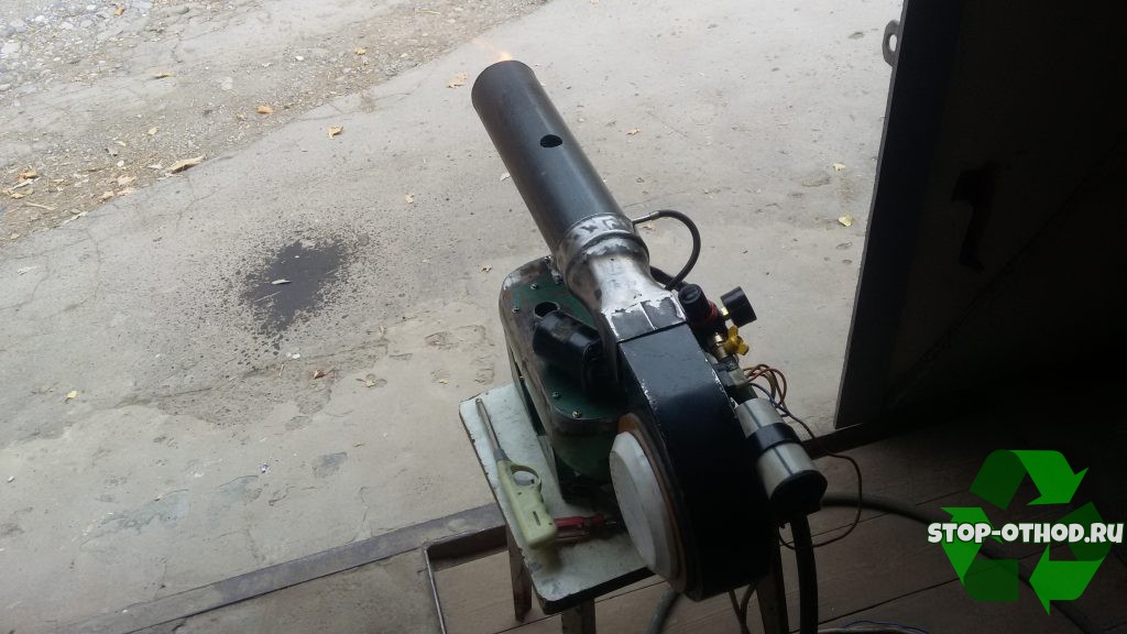 Двигатель насоса для подачи отработки подключается к сети с напряжением 220В. Масло (отработка) из бака поступает по медной трубке, с одной стороны, трижды обмотанной вокруг сопла, а с другой заведенной в бак через масляный фильтр.