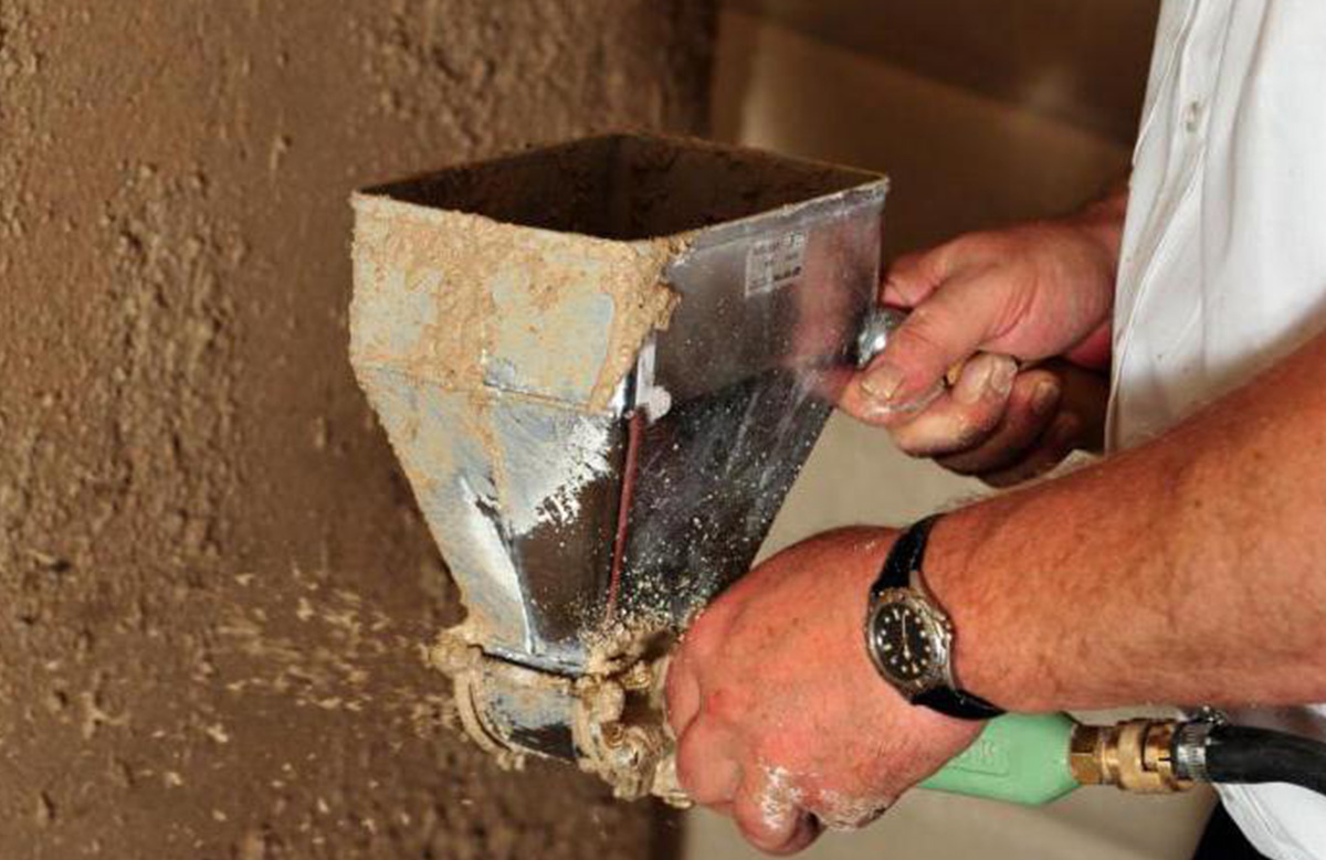 - Подготовки самой смеси. При использовании традиционных компонентов штукатурки – песка и цемента – её следует готовить менее вязкой, а лучше вообще использовать растворы на гипсовой основе. Для повышения производительности и удобства работ с хоппер-ковшом целесообразно добавлять в основную смесь модифицирующие добавки.