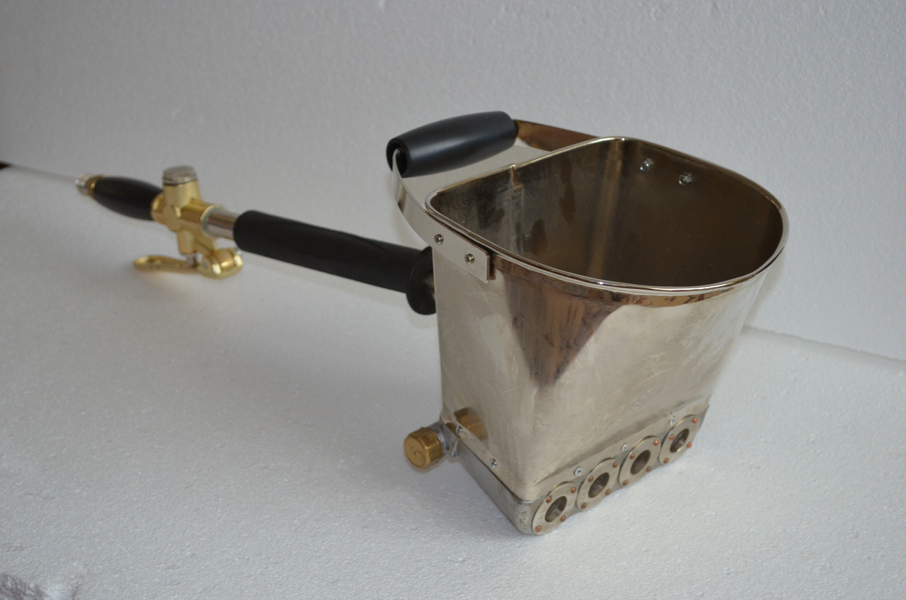 Стеновой хоппер ковш от итальянской компании TeaM. Оборудован контейнером для строительных смесей объемом 3,5 литра. Имеются 4 выходные сопла стандартного диаметра – 20 мм. Выполнен из нержавеющей стали.