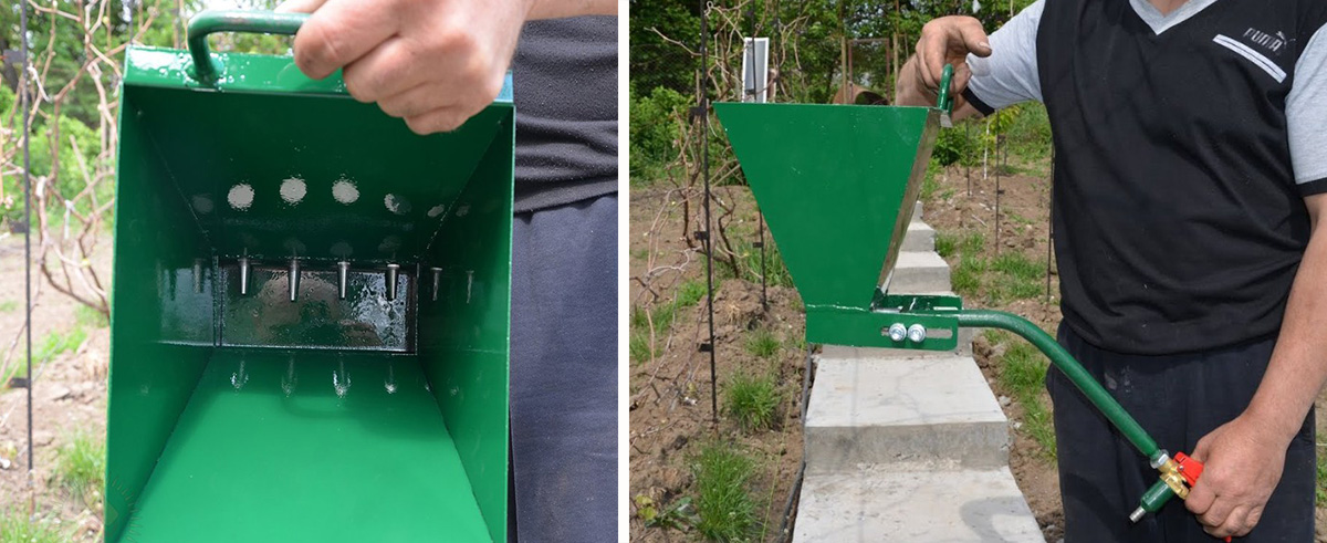 - Объем резервуара (достаточно 4-5 литров) и форма. В зауженной части емкости выдерживается расстояние между стенками с отверстиями в пределах от 20 до 50 мм. Параметр зависит от мощности подключаемого компрессора.