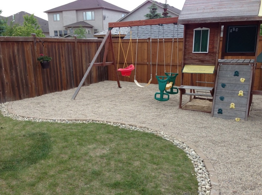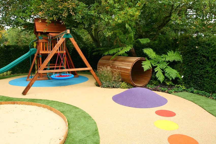 - Пол или небольшой участок именно детской игровой территории желательно устелить резиновой крошкой. Точнее, покрытием из неё. Тогда разбитые коленки останутся в прошлом.