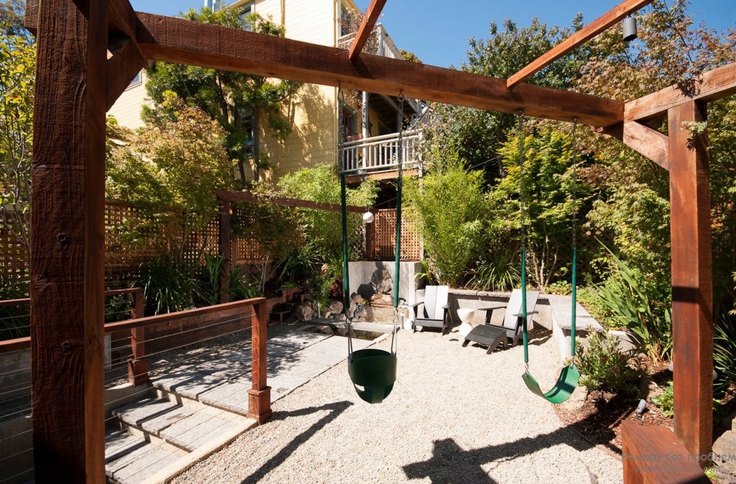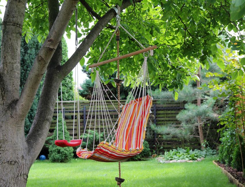 Качели так же удачная деталь, выбор модели зависит от выбранного стиля дизайна.