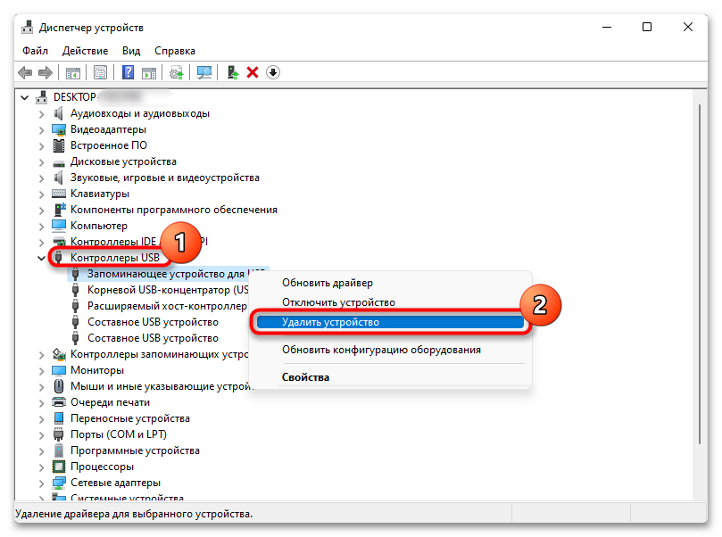 В «Диспетчере устройств» на этот раз выберите «Контроллеры USB». Щелкайте по значку каждого устройства правой кнопкой мыши и выбирайте «Удалить».