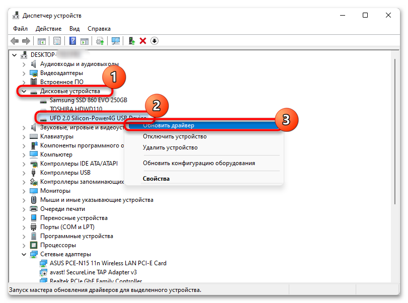 Выделите «Дисковые устройства», найдите в списке флешку. Кликните по значку USB-накопителя правой кнопкой мыши и выберите «Обновить драйвер».