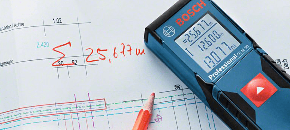 В строительстве лазерный дальномер часто используется для измерения расстояния до стен и порогов. С его помощью можно также вычислять площади помещений. Прибор нужно установить на нужную опцию, установить на рабочей поверхности и направить лазер на интересующий объект, например, противоположную стену. Для получения более точных показаний дальномер необходимо устанавливать строго перпендикулярно. Для облегчения этой задачи в строительных лазерных измерителях имеется специальный уровень с пузырьком.