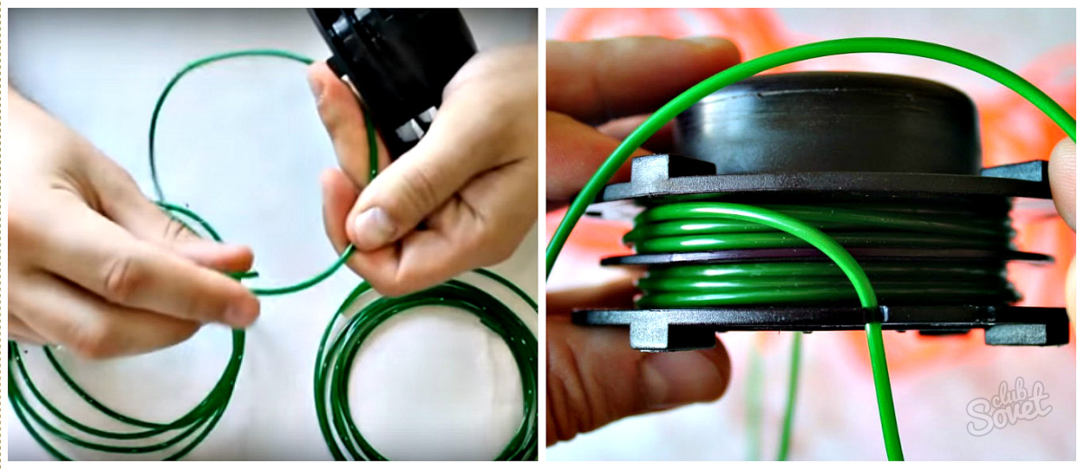 С двух сторон намотать леску по направлению стрелки. Концы длиной 15 см стоит оставить не намотанными. Эти концы вставляются в противоположные прорези. Затем концы закрепляются в отверстии на головке.
