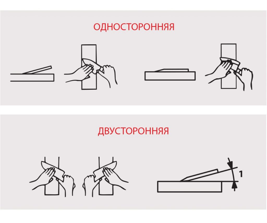 - Двусторонняя асимметричная. Выполняется таким образом, чтобы ширина одной и второй стороны режущих кромок были разными. Такой способ дает возможность без приложения усилий нарезать даже очень твердые продукты, материалы ровными фрагментами разных размеров.