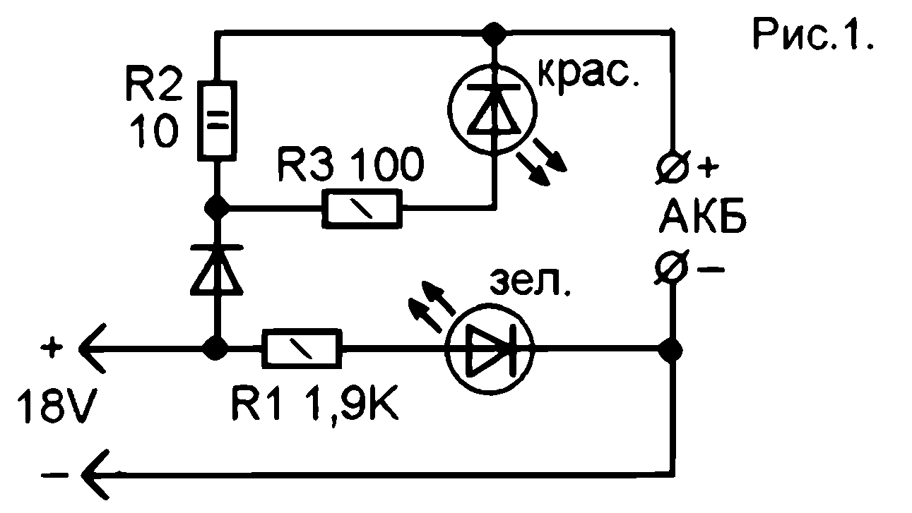 Рассмотрим работу схемы. При зарядке ток протекает через R1 и происходит падение напряжения на нем, достаточное для срабатывания светодиода. По мере заряда ток в цепи уменшится и падение напряжения на R1 будет недостаточно для свечения индикатора.