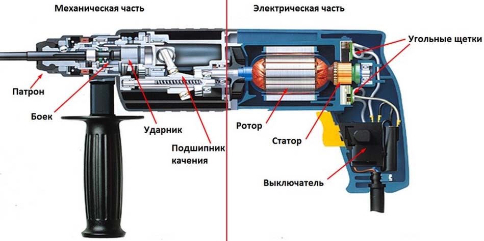 Перфоратор – это универсальный инструмент, который обладает большими возможностями. Внутри него имеется пневматическое устройство, толкающее поршень, который соприкасается с бойком. Последний заставляет оснастку совершать возвратно-поступательные движения. В результате насадки разрушают любую поверхность. Наличие функции удара позволяет инструменту проделывать отверстия в твердых материалах.
