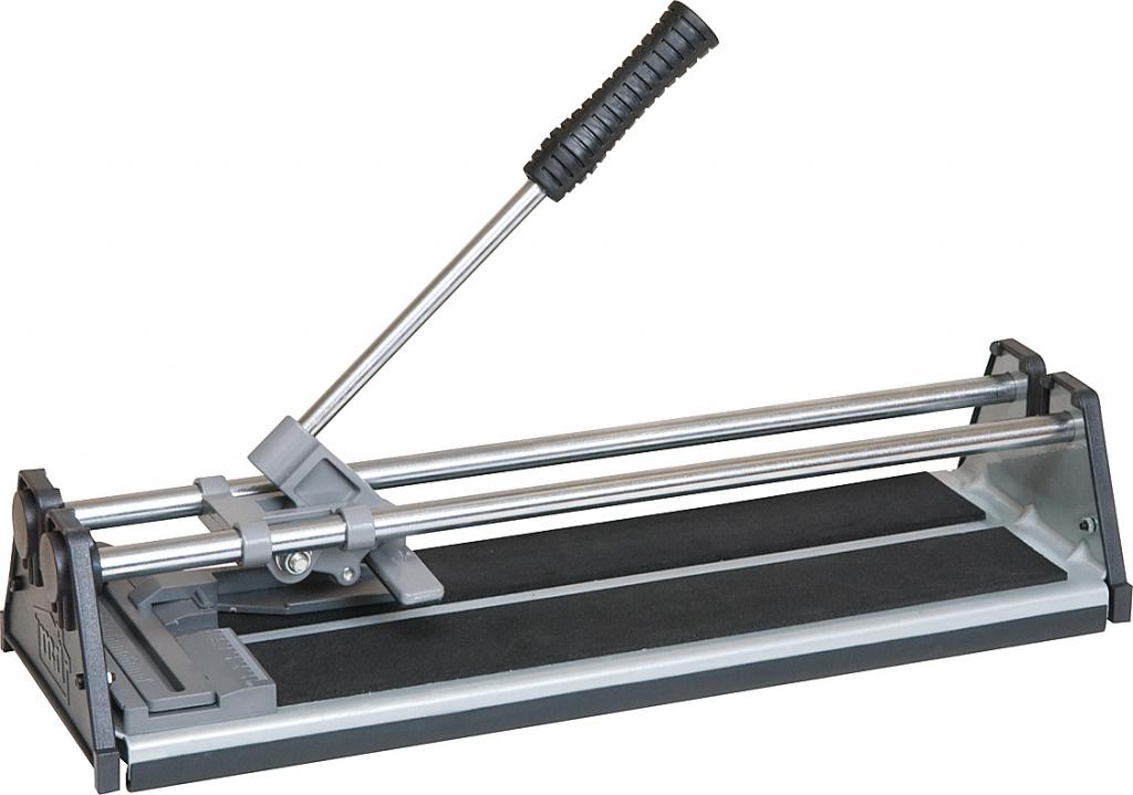 При помощи этого инструменты вы можете выполнить только прямые резы вдоль одной из сторон плитки или по диагонали. Плиткорез имеет основание, на нем закреплены полозья, по ним движется каретка и режущий ролик.