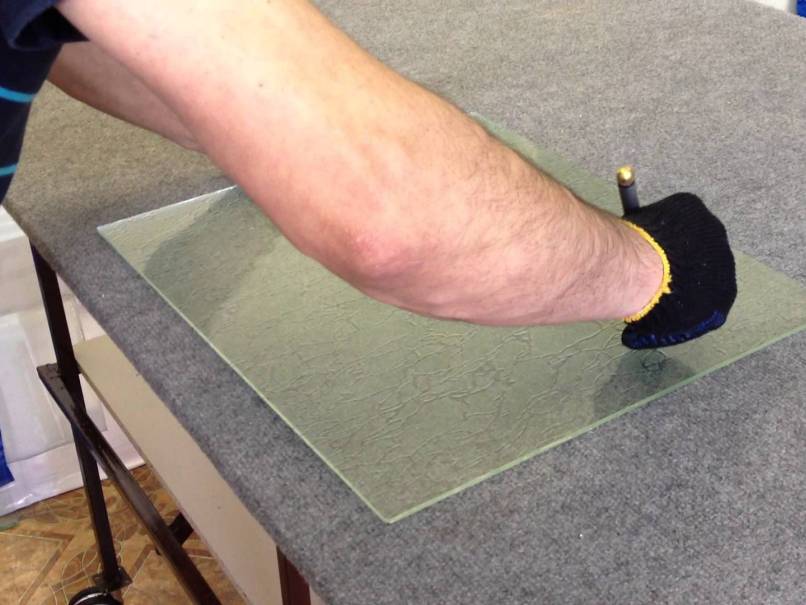 - Стекло лучше не класть прямо на металлическую или деревянную поверхность, так они могут поцарапать друг друга, да стекло может соскользнуть или сместиться. Подстелите кусок ткани, плотной плёнки либо резины — это смягчит поверхность и улучшит сцепление.