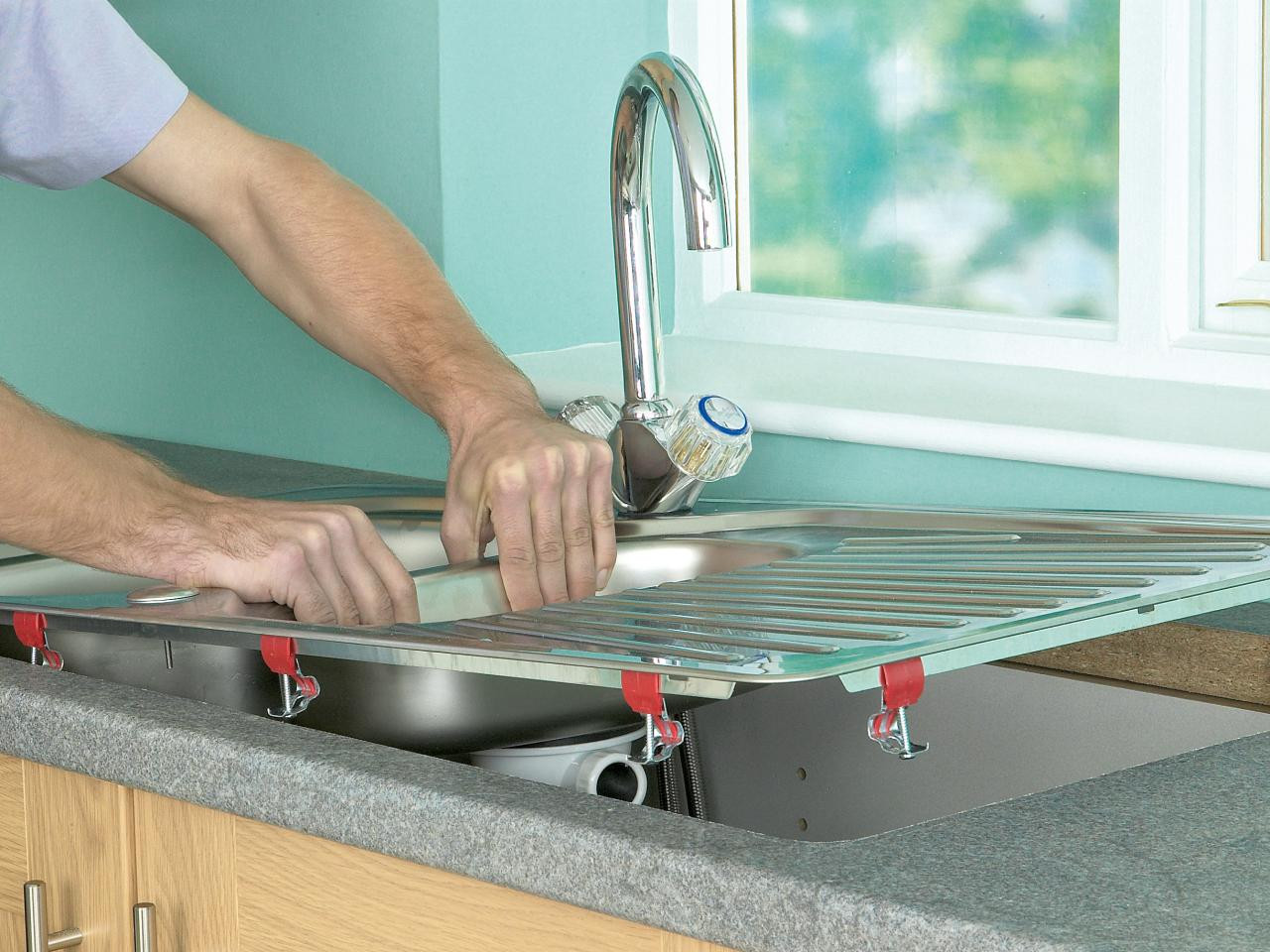 Для закрепления мойки в ней предусмотрены стальные петли, расположенные по контуру чаши в количестве от 4 до 10 штук. В них продеваются винтовые зажимы, имеющие форму лапок, края которых следует ориентировать наружу. После этого мойка опускается в отверстие и окончательно выравнивается, затем винты затягивают, плотно прижимая бортики к столешнице.