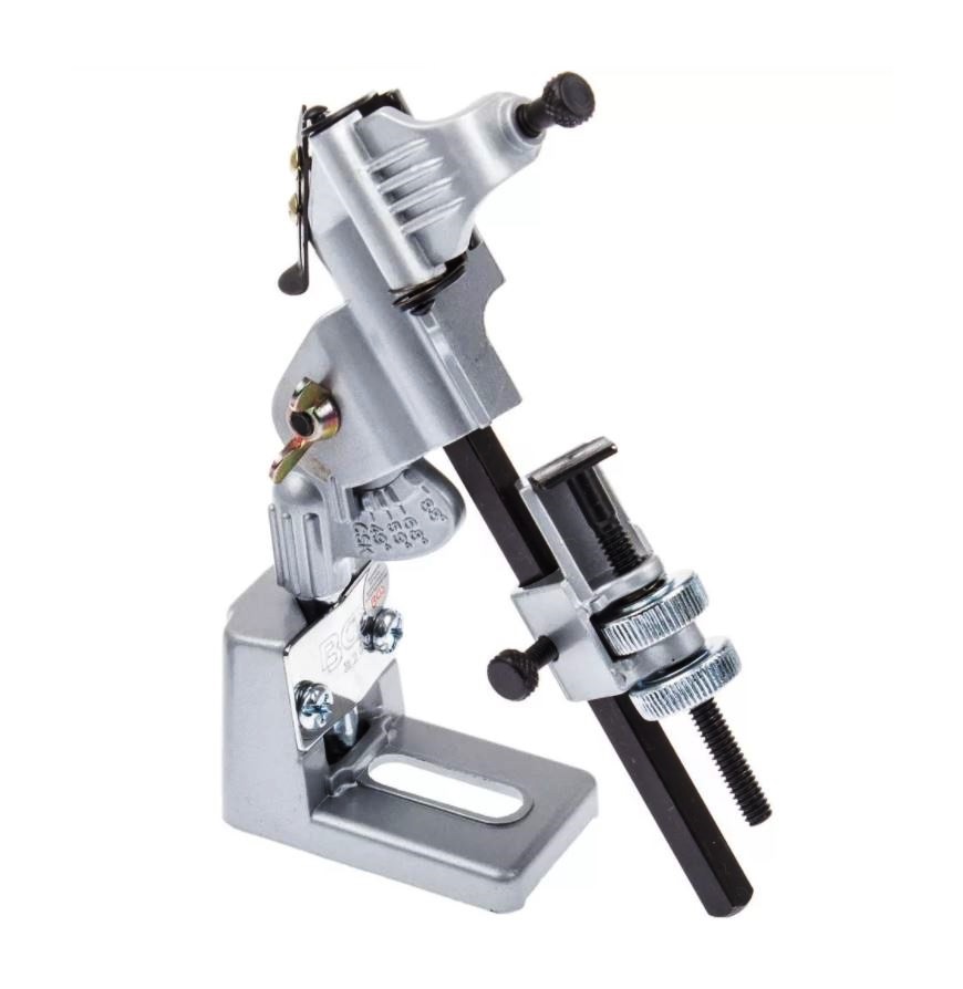 Это довольно продвинутый инструмент, который позволяет контролировать характеристики заточки с точностью до микрон. Все линейные параметры надежно фиксируются, значения выставляются по разметке. Сверло крепится в желобе, случайное смещение или поворот вокруг своей оси исключен.