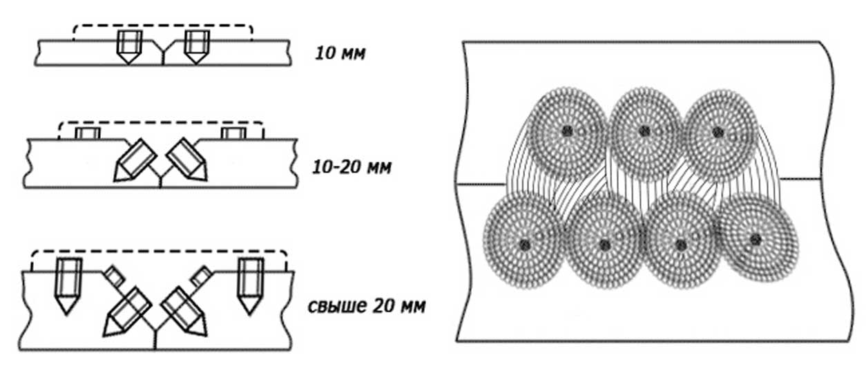 Зона сплавления – самое уязвимое место соединения из-за отслаивания металла шва. Чтобы ее разгрузить при охлаждении и усадке, используют стальные шпильки (завертыши).